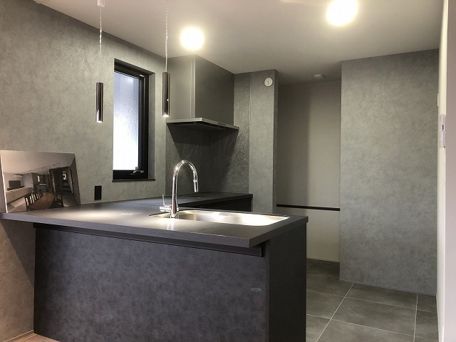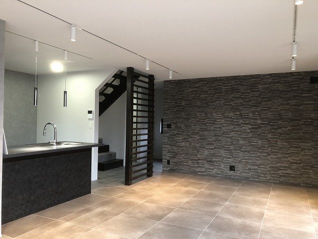 床は磁器質タイル、ダイニング脇の壁はエコカラットでお洒落