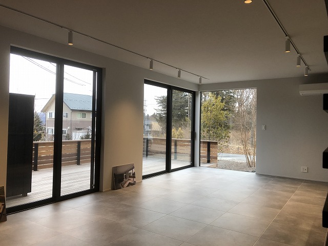 国道18号線から北へ少し入ったところのモノトーンを基調としたデザイン性高い新築別荘です。